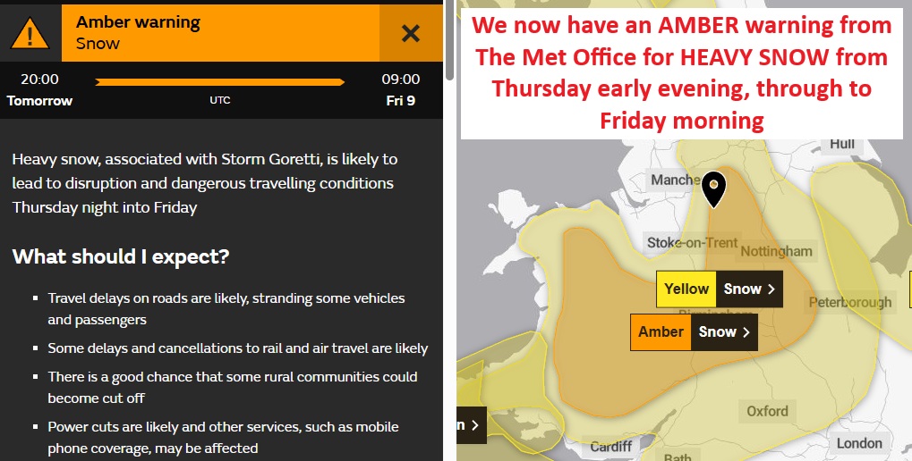Thursday Evening and Night: (Storm Goretti - we are very likely in for a significant disruptive snow event occurring through Thursday night and into Friday) - rain showers, at first in early evening - all turning turning more and more to snow as temperatures drop further, and snow become heavy and prolonged, with likely blizzard conditions in strong and bitterly cold easterly winds overnight - the blizzards will be especially fierce over higher ground in The Peak District (Snow levels downgraded as the system is remaining a little further south - I would say around 10 - 15cm of snow possible - perhaps 25mm in places , particularly over higher ground) - strong easterly winds gusting over 35mph - a ground and air frost everywhere - Minimum temperature 0°C....feeling very cold! - BEWARE!... with Wind Chill this will feel like -6°C.!